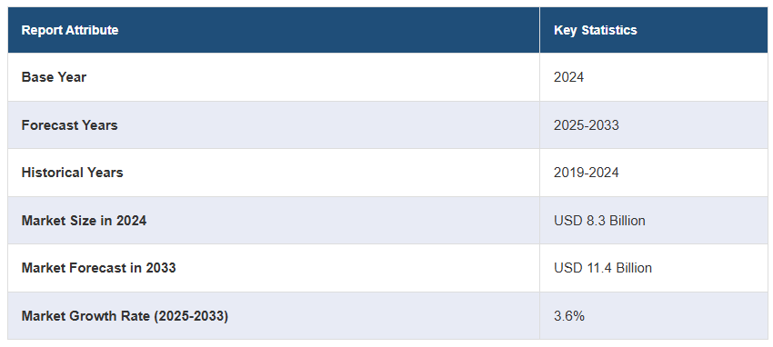 글로벌 우물 개입 시장 규모는 2024년에 83억 달러에 달할 것으로 예상됩니다. IMARC 그룹은 2033년까지 시장 규모가 114억 달러에 달할 것으로 예상하고 있으며, 2025-2033년 동안 연평균 성장률(CAGR)이 3.6%에 달할 것으로 전망하고 있습니다. 성숙된 유전 및 가스전의 증가, 정제된 석유 제품에 대한 수요 증가, 급속한 기술 발전, 그리고 석유 및 가스에 대한 수요 증가가 유정 개입 시장 점유율을 견인하는 요인들입니다.