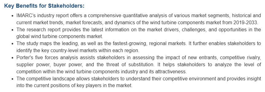 이 시장 조사 보고서는 시장의 경쟁 구도에 대한 포괄적인 분석도 제공합니다. 모든 주요 기업의 상세한 프로필도 제공됩니다. 풍력 터빈 부품 산업의 주요 시장 참여자 중 일부는 Enercon GmbH, GE Renewable Energy, Nordex SE, Northern Power Systems Corp. (Distributed Energy Systems Corp.), Siemens Gamesa Renewable Energy (Siemens AG), Sinovel Wind Group Co. Ltd., Suzlon Energy Ltd., United Power Inc. (United Power Technology), Vestas Wind Systems A/S 및 Xinjiang Goldwind Science & Technology Co. Ltd. 등을 조사하고 있습니다.