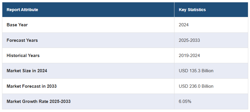 글로벌 풍력 터빈 부품 시장 규모는 2024년에 1,353억 달러에 달할 것으로 예상됩니다. IMARC 그룹은 2033년까지 시장 규모가 2,360억 달러에 달할 것으로 예상하고 있으며, 2025-2033년 동안 연평균 성장률(CAGR)이 6.05%에 달할 것으로 전망하고 있습니다. 재생 에너지에 대한 수요 증가, 풍력 에너지 프로젝트에 대한 인센티브 증가, 터빈 설계의 기술 발전, 풍력 기술 비용 감소, 지속 가능한 에너지 인프라에 대한 필요성 증가 등이 시장 성장을 견인하는 요인입니다.
