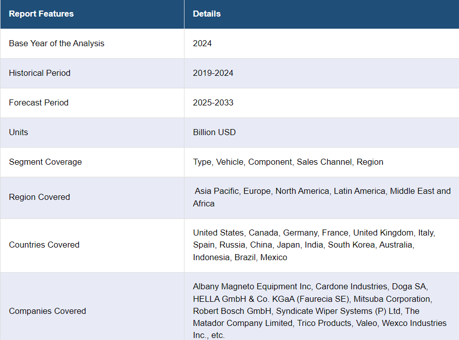 이 보고서는 또한 글로벌 와이퍼 시스템 시장의 경쟁 환경에 대한 포괄적 인 분석을 제공했습니다. 모든 주요 기업의 자세한 프로필도 제공되었습니다. 이 보고서에서 다루는 회사 중 일부에는 Albany Magneto Equipment Inc, Cardone Industries, Doga SA, HELLA GmbH & Co. KGaA(포레시아 SE), 미쓰바 주식회사, 로버트 보쉬 주식회사, 신디케이트 와이퍼 시스템(P) 주식회사, 마타도르 컴퍼니 리미티드, 트리코 제품, 발레오, 왁스코 인더스트리즈 등이 포함됩니다. 이는 일부 기업 목록일 뿐이며, 전체 목록은 보고서에서 확인할 수 있습니다.