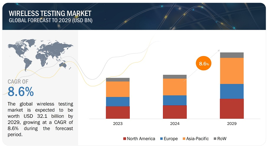 무선 테스트 시장은 2024년 226억 달러에서 2029년 341억 달러로 성장하여 예측 기간 동안 8.6%의 CAGR을 기록할 것으로 예상됩니다. 스마트 시티와 커넥티드 카의 인기 증가, 5G, NB-IoT, LTE-M과 같은 무선 기술의 발전, 고급 및 휴대용 의료 장비의 무선 테스트 보급 증가가 향후 5년 동안 시장을 견인할 것으로 예상됩니다. 그러나 기술 발전에 따른 장비 및 서비스의 지속적인 업그레이드 요구는 업계 플레이어에게 도전 과제가 될 것입니다.
