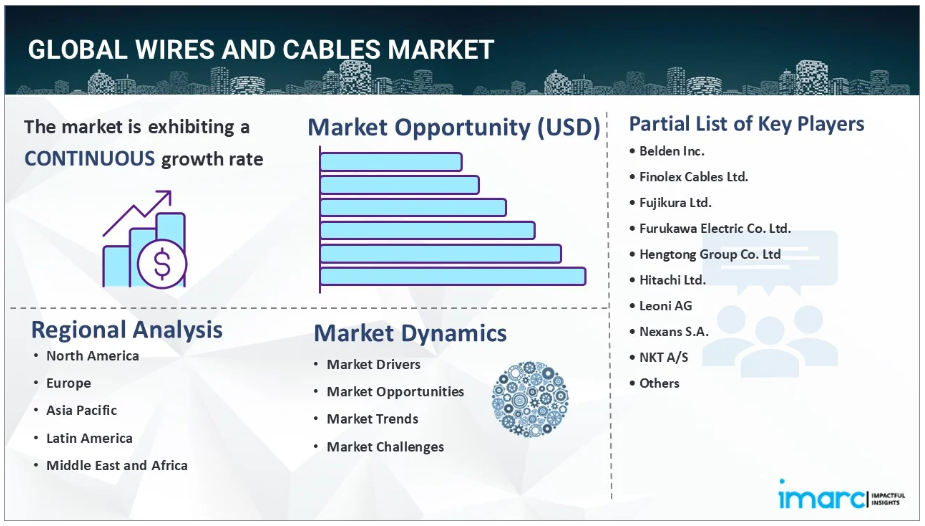 주요 시장 동인: 전선 및 케이블 시장의 성장을 이끄는 요인으로는 전 세계적으로 재생 에너지가 크게 확대되면서 태양광 패널과 풍력 터빈에 막대한 양의 케이블을 사용해야 한다는 점을 들 수 있습니다. 또 다른 요인은 개발도상국의 급속한 도시화로 인해 새로운 도심에 대한 전력망의 필요성이 크게 증가했다는 점입니다. 전 세계적으로 5세대(5G) 네트워크를 중심으로 한 통신 인프라의 확장이 시장 성장을 촉진하고 있습니다. 전 세계 자동차 산업이 전기 자동차(EV)로 전환함에 따라 보다 전문화된 형태의 차량용 케이블이 필요해지면서 전선 및 케이블 시장 점유율이 더욱 높아지고 있습니다. 스마트 그리드와 스마트 홈에 대한 투자가 증가함에 따라 데이터와 전기를 모두 전송하는 새로운 유형의 첨단 케이블 시스템이 사용되어 시장 성장이 더욱 가속화되고 있습니다.