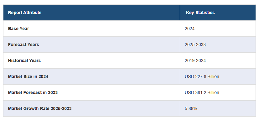 전 세계 전선 및 케이블 시장 규모는 2024년 2,278억 달러에 달했습니다. 앞으로 IMARC 그룹은 2025~2033년 동안 5.88%의 성장률(CAGR)을 보이며 2033년까지 시장이 3,812억 달러에 달할 것으로 예상하고 있습니다. 급속한 도시화 및 산업화, 재생 에너지 프로젝트의 확대, 전기 자동차(EV) 도입, 기술 발전, 스마트 그리드 시스템의 부상, 데이터 센터의 확산, 인프라 현대화 및 스마트 시티 프로젝트에 대한 투자를 위한 정부 이니셔티브가 시장 성장에 박차를 가하고 있습니다.