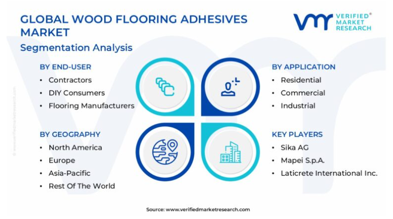 글로벌 목재 바닥재 접착제 시장은 접착제 유형, 용도, 최종 용도, 지리적 위치에 따라 세분화됩니다.