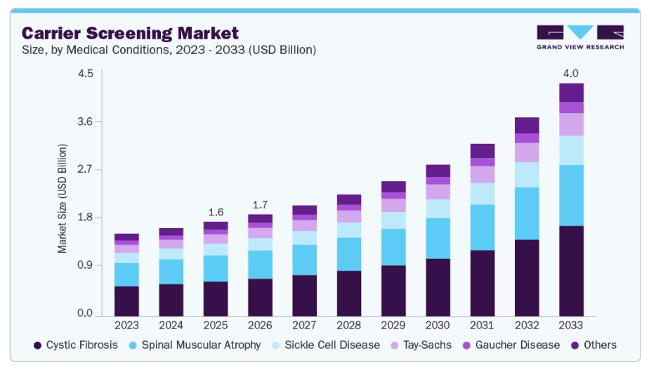 | ■ 영문 제목 : Carrier Screening Market Size, Share & Trends Analysis Report By Medical Conditions (Spinal Muscular Atrophy, Cystic Fibrosis, Tay-Sachs, Gaucher Disease, Sickle Cell Disease), By Type, By Technology, By End Use, By Region, And Segment Forecasts, 2026 - 2033 | |