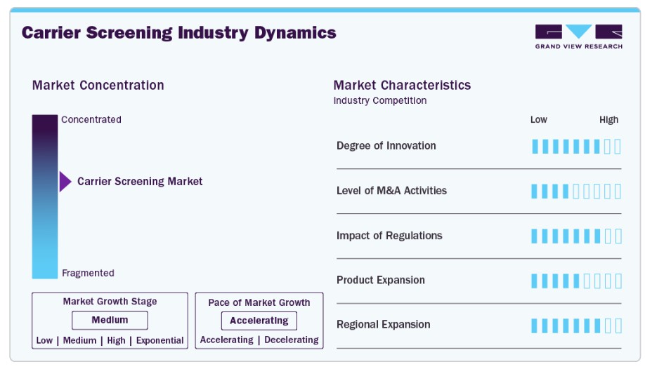 예를 들어, 세계보건기구(WHO)에 따르면 약 1,000명 중 10명이 영향을 받으며, 이는 전 세계적으로 7천만에서 8천만 명의 사람들이 이러한 질환을 앓고 있음을 의미합니다. 겸상적혈구병(SCD)만 해도 미국에서 10만 명 이상에게 영향을 미치며, 특히 아프리카계 미국인 출신 인구에서 유병률이 매우 높습니다. 특히 차세대 염기서열 분석(NGS) 및 생물정보학 분야의 선별 기술 발전은 정확성, 속도, 경제성을 개선함으로써 보인자 선별 시장을 혁신했습니다. 기존 유전자 선별 검사는 일반적으로 특정 집단이나 고위험군을 대상으로 제한된 질환군에 집중되었습니다. 반면 현대식 NGS 기반 패널은 단일 실행으로 수백 가지 유전자 변이를 선별하여 훨씬 광범위하고 포괄적인 평가를 제공합니다. 예를 들어, 2025년 2월 F. Hoffmann-La Roche AG(스위스)는 암, 면역 장애, 신경퇴행성 질환과 같은 복잡한 질병 해독에 핵심적인 역할을 하는 차세대 확장 시퀀싱(SBX) 기술의 새로운 범주를 도입했습니다. 이 기술은 대상 분자의 DNA 서열을 결정하기 위해 고처리량 센서 모듈과 합성 분자를 함께 사용합니다. 게다가 유전자 위험에 대한 인식 증가와 맞춤형 의학으로의 글로벌 전환이 보균자 검사 시장 확장을 주도하고 있습니다. 개인과 부부가 생식 건강 관리에 점점 더 적극적으로 나서며 유전자 상담과 검사를 동시에 찾고 있습니다. 이는 보균자 상태가 가족 계획, 임신 결과, 미래 세대의 건강에 직접적인 영향을 미친다는 인식이 확산되고 있음을 반영합니다. 보균자 검사의 기초는 조기 발견 프로그램을 통해 건강 결과를 개선하기 위한 인식 제고에 있습니다. 아슈케나지 유대인 커뮤니티에서 시행된 테이-삭스병 선별 검사 같은 초기 프로그램은 교육과 검사가 질병 유병률을 극적으로 감소시킬 수 있음을 보여주었습니다. 마찬가지로 아프리카계 미국인 집단에서 진행된 지역사회 주도형 겸상적혈구 선별 노력은 적극적인 참여의 중요성을 강조했으나, 이후 정부 주도 사업은 부실한 실행과 잘못된 정보의 위험성을 드러냈습니다. 이러한 역사적 교훈은 개인과 지역사회가 정보에 기반한 생식 및 의료 결정을 내리기 위해 유전적 통찰을 점점 더 추구하는 맞춤형 의료로의 광범위한 추세를 강조합니다. 그러나 시장 내 주요 과제 중 하나는 기존 단일 염기 서열 NGS 기술이 반복 확장, 구조적 변이, 메틸화 서명, 고동질성 유전자 등 복잡한 게놈 영역을 처리하는 데 어려움을 겪는다는 점이다. 이러한 격차를 해소하기 위해 HiFi 기술을 포함한 고정밀 장염기 서열 분석과 같은 혁신이 등장하고 있다. 예를 들어, 2025년 9월 PacBio는 HiFi 시퀀싱 기술을 기반으로 한 고처리량 보인자 선별을 위한 확장된 PureTarget 포트폴리오를 출시했습니다. 이 솔루션은 여러 검사를 단일 확장 가능한 테스트로 통합하여 워크플로를 간소화함으로써 까다로운 유전자에 대한 정확한 분석을 가능하게 합니다. 시장 집중도 및 특성보인자 스크리닝 시장은 차세대 시퀀싱(NGS) 및 전체 엑솜 시퀀싱, 비용 절감 및 처리량 증가, 확장된 패널 및 광범위한 질환 커버리지에 힘입어 높은 혁신성을 보여줍니다. 차세대 시퀀싱(NGS)은 소수의 유전자에서 알려진 소수의 변이에서 모든 유전자와 인구집단을 아우르는 포괄적인 위험 평가로 진화했습니다. 대형 진단 기업들이 독자적 보인자 선별 기술을 보유한 신생 기업을 인수함에 따라 인수합병(M&A)이 이 시장을 점점 더 주도하고 있습니다. M&A 활동은 기술 역량을 확장하고 가격 정책에 영향을 미치며 검사 접근성을 확대하고 있습니다. 또한 유전 질환 발생률 증가로 시장 참여자들은 서비스 제공 범위와 시장 진출을 강화하기 위해 인수합병을 추진하고 있습니다. 복잡한 연방 및 주 법률, 임상 지침, 보험급여 정책, 윤리적 고려사항으로 인해 규제 영향이 크다. 예를 들어 미국에서는 1988년 임상실험실개선법(CLIA)이 유전자 검사를 포함한 모든 임상실험실 검사에 대한 품질 기준을 확립했다. 검사 정확도, 신뢰성, 시의적절성에 대한 엄격한 요구사항은 검사 제공업체의 진입 장벽을 높인다. 전 세계적으로 캐리어 스크리닝 시장의 제품 확장은 중간 수준이다. 이는 원활한 EMR 통합, 모듈식 자동화 시스템, 장독자 염기서열 분석, 비침습적 PGT(착상 전 유전자 검사) 등 기술 중심적 특성 때문이다. 원활한 EMR 통합은 의사가 검사를 쉽게 주문하고 결과를 환자의 전자 의료 기록(EMR)에서 직접 확인할 수 있도록 하는 통합 전자 주문 시스템을 구축한다. 북미는 보인자 검진 도입에서 선도적 역할을 수행하며, 특히 미국은 선진 의료 인프라와 산전 관리에 유전자 검사가 통합되면서 성장을 주도하고 있습니다. 또한 유럽에서는 공공 의료 시스템이 비용, 형평성, 자원 고려 사항으로 인해 신중한 태도를 유지하는 반면, 확장형 보인자 검진(ECS)이 특히 사립 불임 클리닉을 중심으로 점차 확산되고 있습니다. 보고서 범위 및 제공 내용의학적 상태별 인사이트의학적 상태 기준으로, 낭포성 섬유증(CF)은 2025년 36.69%로 가장 큰 시장 점유율을 차지했으며 예측 기간 동안 가장 빠른 성장이 예상됩니다. CF는 유럽계 인구 집단에서 가장 흔