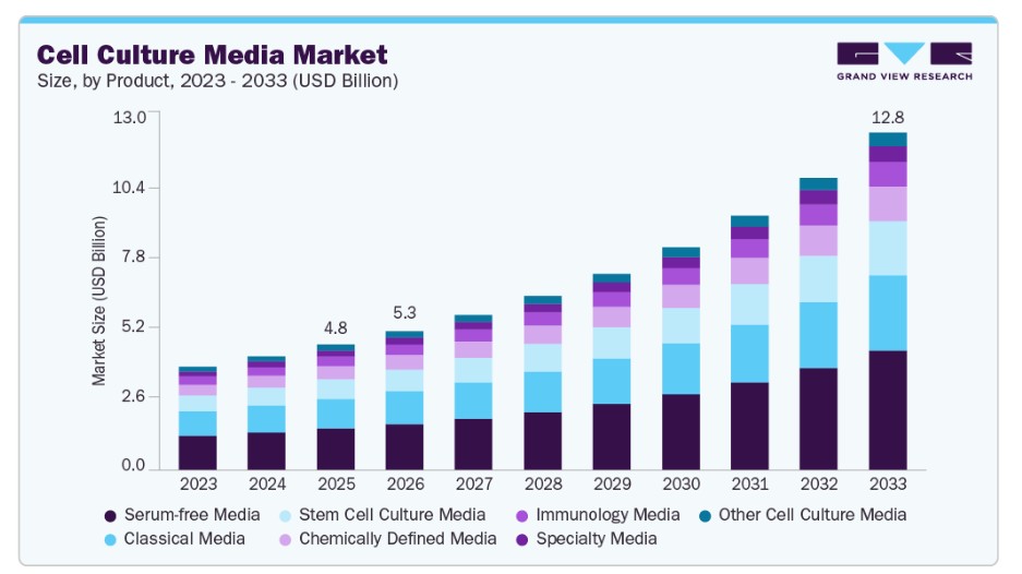 | ■ 영문 제목 : Cell Culture Media Market Size, Share & Trends Analysis Report By Product (Serum-free Media, Classical Media), By Type (Liquid Media, Semi-solid And Solid Media), By Application, By End Use, By Region, And Segment Forecasts, 2026 - 2033 | |