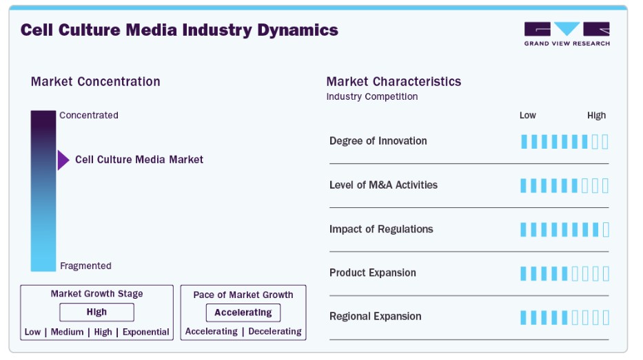 시장 성장은 바이오의약품 및 세포 기반 백신의 생산 증가와 함께 암, 재생의학, 줄기세포 치료 분야에서 세포 기반 연구의 확대에 의해 주도되고 있습니다. 무혈청 배지 및 일회용 시스템 등 바이오프로세싱 기술의 발전은 수요를 더욱 뒷받침하고 시장 확장을 가속화하고 있습니다. 줄기세포 연구의 성장줄기세포 치료는 재생의학 분야에 혁명을 일으킬 수 있는 새롭고 매우 유망한 과학 연구 영역을 대표합니다. 줄기세포는 조직과 장기의 치유에 필수적이며, 인간 발달의 복잡한 과정에 대한 정보의 원천 역할도 합니다. 따라서 줄기세포 생물학 기초 연구를 지원하는 도구로서 줄기세포 배양 방법의 개선에 대한 관심이 높아지고 있으며, 치료적 적용성을 높이는 방안이 점점 더 주목받고 있습니다. 과학자와 임상의들이 줄기세포의 증식과 분화를 촉진하기 위해 보다 효율적이고 정밀하게 정의된 배양 환경을 모색하는 추세는 줄기세포 전용으로 특별히 설계된 고품질의 신뢰할 수 있는 세포 배양 배지에 대한 강력한 수요로 이어지고 있으며, 이는 줄기세포 배양 배지 산업의 배지 수요를 촉진하고 있습니다. 이러한 증가하는 수요를 충족시키기 위해 주요 제조사들은 줄기세포 연구 발전을 위한 혁신적인 제품을 출시했습니다. 예를 들어, 2024년 7월 바이오서브 인디아(Bioserve India)는 국내 과학 연구 및 신약 개발을 지원하기 위해 세포 배양 솔루션과 재프로그래밍 도구를 포함한 새로운 줄기세포 제품군을 출시했습니다. 마찬가지로, 2024년 12월, 선도적인 세포 치료 CDMO 기업인 바이오센트릭(BioCentriq)은 뉴저지주 프린스턴에 새로운 본사 건물을 장기 임대 계약을 체결하고, 세포 치료 분야의 개발, 제조 및 품질 관리 서비스 강화를 위해 1,200만 달러를 투자했습니다. 이러한 전략적 발전은 줄기세포 분야의 성장 동력을 반영하며, 연구 및 임상 적용을 지원하는 데 있어 첨단 세포 배양 배지의 중요성이 점점 더 커지고 있음을 보여줍니다. 세포 기반 백신 연구를 위한 신흥 세포 배양 기술세포 배양 기반 바이러스 백신은 전통적인 계란 기반 접근 방식에 비해 더 안전하고 효율적인 백신 생산 방법을 제공하며, 글로벌 예방접종 전략의 핵심 요소로 자리매김했습니다. 세포 배양 배지의 지속적인 발전은 백신의 안정적이고 확장 가능한 생산을 가능케 하여, 엄격한 안전 및 규제 요건을 준수하면서 증가하는 글로벌 수요를 충족시키고 있습니다. 미국 질병통제예방센터(CDC)에 따르면, 2020년부터 2021년까지 독감 백신 생산에 사용된 바이러스는 계란 배양 방식이 아닌 세포 배양 방식으로 생산되었습니다. 이는 계란 기반 배양이 항원적 변화를 유발할 가능성이 있기 때문입니다. 이러한 변화는 백신 균주와 유행 바이러스 간의 불일치를 초래하여 백신 효과를 저하시킬 수 있습니다. 또한 FDA가 세포 기반 후보 백신 바이러스(CVV)를 승인함으로써 더 일관되고 잠재적으로 더 효과적인 독감 백신의 개발 경로가 강화되었습니다. 세포 배양 기술의 활용 범위는 인플루엔자를 넘어 천연두, 로타바이러스, 풍진, 간염, 수두, 소아마비 등 다양한 질병 백신으로 확장됩니다. 특히 2024년 12월, 메소블라스트(Mesoblast)는 소아 환자의 스테로이드 불응성 급성 이식편대숙주병(SR-aGvHD) 치료를 위한 중간엽 줄기세포(MSC) 치료제인 라이온실(Ryoncil, remestemcel-L)에 대해 FDA 승인을 획득했으며, 이는 미국에서 승인된 최초이자 유일한 MSC 치료제입니다. 라이온실은 또한 생물학적 제제 내성 염증성 장질환을 포함한 다른 염증성 질환에 대해서도 개발 중입니다. 생물학적 모델의 지속적인 발전, 세포 배양 배지의 정교화, 동물 유래 성분에 대한 의존도 감소는 세포 기반 백신 개발의 혁신을 지속적으로 촉진하고 있습니다. 또한 백신 제조에 세포 배양 배지 백의 채택이 증가하면서 세포 배양 배지 산업이 성장하고 있습니다. 이는 고수율 세포 증식을 위한 무균, 확장 가능, 오염 없는 환경을 제공하기 때문입니다. 바이오리액터와의 쉬운 통합, 세척 필요성 감소, 빠른 처리 시간으로 인해 세포 기반 백신 생산에 이상적이며, 이는 배지에 대한 시장 수요를 직접 가속화합니다. 보고서 범위 및 제공 내용시장 집중도 및 특성세포 배양 배지 산업은 바이오의약품, 진단 및 연구 분야의 수요 증가에 힘입어 고성장 단계에 있습니다. 이 시장은 배지 제형의 급속한 발전, 생명공학 연구에 대한 투자 증가, 약물 개발, 재생 의학 및 맞춤형 치료법에서의 응용 확대가 특징입니다. 경쟁 역학 및 혁신은 주요 업체 간 신제품 출시 및 협력을 촉진합니다. 예를 들어, 2024년 12월 미국 소재 크리에이티브 바이오랩스(Creative Biolabs)는 줄기세포 치료 연구 가속화를 위한 첨단 iPSC 및 FGF2 솔루션을 출시하며 전 세계 재생의학 프로젝트에 맞춤형 과학적 지원을 제공했습니다. 세포 배양 배지 산업은 시장 통합 필요성과 제품 포트폴리오 확장에 힘입어 높은 수준의 인수합병(M&A) 활동을 경험하고 있습니다. 주요 기업들은 역량 강화, 첨단 기술 확보, 글로벌 시장 확대를 위해 중소 기업을 인수하고 있습니다. 예를 들어, 2022년 3월 후지필름은 일본과 미국의 생명