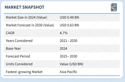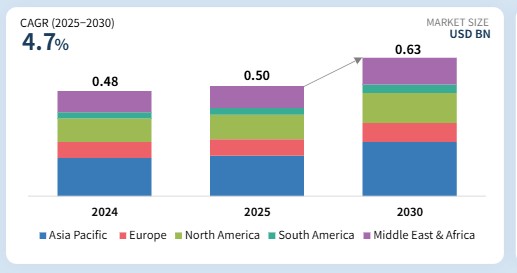 원심분리기 시장은 2025년 5억 달러에서 2030년까지 6억 3천만 달러에 달할 것으로 전망되며, 예측 기간 동안 연평균 성장률(CAGR) 4.7%를 기록할 것으로 예상됩니다. 원심분리기 시장은 제약, 생명공학, 식품 및 음료, 화학, 광업, 폐수 처리 등 다양한 산업 분야에서의 폭넓은 적용으로 인해 강력한 성장을 보이고 있습니다. 원심분리기는 고체-액체 분리, 유체 정화 및 제품 정제에 핵심적인 역할을 수행하여 산업 및 실험실 용도 모두에 필수적입니다. 제약 및 생명공학 분야에서는 생물학적 제제, 백신, 세포 기반 치료제에 대한 수요 증가로 정밀 분리를 위한 첨단 고속 및 초고속 원심분리기의 도입이 촉진되고 있습니다. 한편 산업 부문은 전 세계적 지속가능성 이니셔티브와 엄격한 환경 규제에 부응하여 폐수 관리, 슬러지 탈수, 자원 회수에 원심분리기에 크게 의존하고 있습니다.