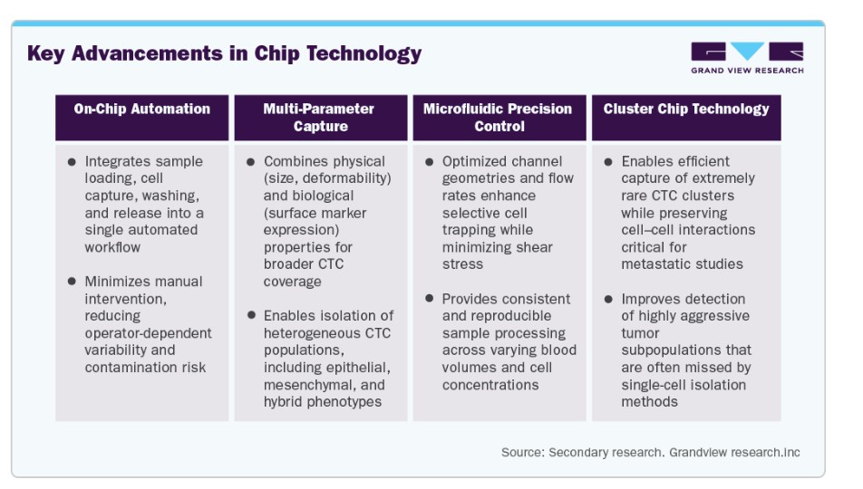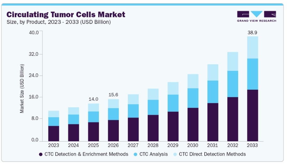 칩 기술의 발전지속적인 칩 기술 발전은 시장 성장에 긍정적인 영향을 미쳤습니다. 클러스터 칩 기술은 CTC(순환종양세포)와 같이 극히 드문 세포 군집을 포착하는 데 중요한 역할을 합니다. CTC 분리 과정은 번거로우며 높은 정확도를 요구합니다. 칩 기술은 정밀한 CTC 분리 수행을 돕는 동시에 주요 기업들이 개발한 분리 장치와 관련된 문제점들을 극복하는 데 기여합니다. 이러한 문제점에는 낮은 감도, 모든 크기와 유형의 CTC 포획 불가능성, 높은 제조 비용, 추가 실험실 분석을 위해 장치에서 포획된 CTC를 회수하기 어려운 점 등이 포함됩니다. 또한, 크기가 유사한 포획된 CTC를 오염시키는 백혈구가 CTC로 오인될 수 있다는 점은 이러한 장치와 관련된 한계입니다. 또한 미세 가공, 표면 화학, 생체 재료 공학의 발전은 CTC 분리 칩의 성능을 더욱 향상시켰습니다. 더불어 라벨 프리(label-free) 및 하이브리드 캡처(hybrid capture) 접근법의 개발로 단일 바이오마커에 의존하지 않고도 이질적인 CTC 집단을 분리할 수 있게 되어 위음성 결과를 줄일 수 있습니다. 이러한 혁신은 향상된 확장성과 하류 분자 분석과의 호환성과 결합되어 칩 기반 CTC 기술의 임상 및 연구 분야 채택을 강화하고 지속적인 시장 성장을 뒷받침하고 있습니다. 보고서 범위 및 제공 내용조기 및 신속한 암 진단에 대한 수요 증가조기 및 신속한 암 진단에 대한 강조가 증가하면서 순환종양세포(CTC) 시장이 주도되고 있습니다. 원발성 또는 전이성 종양에서 혈류로 유출되는 CTC는 종양 진행에 대한 실시간 통찰력을 제공하는 최소 침습적 바이오마커 역할을 합니다. 조기 발견은 시기적절한 치료와 더 나은 환자 결과를 가능하게 하여 임상 환경에서 CTC 기반 기술의 채택을 증가시키고 있습니다. 마이크로플루이딕 장치 및 면역 친화성 기반 칩과 같은 CTC 검출 및 분리 플랫폼의 발전은 더 빠르고 정확한 진단을 가능하게 합니다. 분자 및 유전체 프로파일링과의 통합은 종양 이질성과 약물 내성을 밝혀내 맞춤형 치료를 더욱 지원하며 시장 성장을 촉진합니다. 시장 집중도 및 특성CTC 산업은 포획을 위한 마이크로플루이딕 칩, 검출을 위한 첨단 영상 기술, 분석을 위한 머신러닝 등 주목할 만한 혁신을 경험했습니다. 이러한 기술들은 환자의 암 상태 평가 정확도와 신뢰성을 향상시킵니다. 순환종양세포 산업은 활발한 M&A가 특징이며, 조기 발견, 치료 모니터링, 맞춤형 의학 등의 응용 분야에 대한 관심을 촉진하고 있습니다. 예를 들어, 2023년 5월 메나리니 실리콘 바이오시스템즈(Menarini Silicon Biosystems)는 알리비오 헬스(Alivio Health)와 협력하여 CELLSEARCH 액체 생검 검사를 제공함으로써 비침습적 CTC 분석을 통해 조기 진단과 개선된 치료 결정을 가능하게 했습니다. 규제는 CTC 산업에 상당한 영향을 미칠 수 있습니다. FDA와 같은 규제 기관은 CTC 제품의 안전성과 효능을 결정하는 데 중요한 역할을 합니다. 엄격한 규제는 새로운 CTC 제품 승인 지연으로 이어져 혁신 속도를 늦추고 환자와 의료 제공자에게 제공되는 선택지를 제한할 수 있습니다. 순환종양세포 산업이 발전함에 따라 기업들은 신기술, 전략적 협력, 다중 오믹스 접근법과의 통합을 통해 제품 포트폴리오를 확장하고 있습니다. 예를 들어, 2021년 12월 에픽 사이언스(Epic Sciences)는 전이성 유방암 환자의 치료 개선을 목표로 설계된 혈액 기반 검사인 DefineMBC를 출시했습니다. CTC 시장이 성장함에 따라 지역적 확장은 시장 침투율, 규제 승인 및 채택률 증대에 중요한 역할을 합니다. 암 사례 증가 및 정부 정책으로 인해 개발도상국에서의 채택 증가가 지역 확장의 주요 동인입니다. 예를 들어, 중국: CFDA(NMPA)는 CTC 검출을 위한 셀서치(CellSearch)를 승인하여 병원 채택을 촉진했습니다. 기술 인사이트CTC 검출 및 농축 방법 부문은 2025년 50.68%로 가장 큰 매출 점유율을 차지했습니다. 암 검출에서 순환 종양 세포를 농축하기 위한 다양한 접근법의 가용성은 예측 기간 동안 해당 부문 성장에 상당한 영향을 미칠 것으로 예상됩니다. CTC 검출을 위한 다양한 기술에는 자기 구슬 기반 원심력, 농축, 여과 및 밀도, 변형, 크기, 전하와 같은 기타 물리적 특성이 포함됩니다. CTC 분석은 예측 기간 동안 가장 빠른 연평균 복합 성장률(CAGR)을 기록할 것으로 예상됩니다. CTC 검출을 통한 종양 내 하위 클론 이질성 이해는 표적 치료에 반응하지 않는 환자의 근본 원인을 규명하는 데 도움을 주어 궁극적으로 암 치료법 개선으로 이어질 수 있습니다. 따라서 CTC 분석은 반복 분석에 있어 최소 침습적 방법이며 종양 연구 및 임상 의사 결정에 검증된 기술입니다. 응용 분야 인사이트2025년 기준 임상 응용 분야가 시장을 주도하며 최대 매출 점유율을 차지했습니다. 액체 생검에서 암 환자의 혈류 내 CTC 분석은 잠재적 임상 유용성으로 인해 상당한 주목을 받고 있습니다. 환자의 혈액 내 CTC 수는 암 유형, 단계 및 치료법에 따라 달라질 수 있습니다. 환자의 혈류에서 발견된 CTC 수는 질병 상태를 나타냅니다. 암 후기 단계 환자는 초기 단계 환자보다 더 많은 CTC를 보입니다. CTC는 암 전이, 치료 모니터링 및 전이 조기 발견의 핵