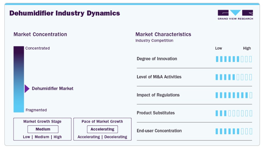 높은 습도는 곰팡이 번식, 알레르기 유발 물질 발생 및 호흡기 질환을 유발하므로, 주거 및 상업 시설 이용자들이 습도 조절 솔루션을 도입하도록 유도하고 있습니다. 또한 도시화의 진전과 생활 수준 향상 역시 가정용 쾌적 환경 가전 제품에 대한 수요를 뒷받침하고 있습니다 산업 및 상업 인프라의 확장은 시장 성장을 뒷받침하는 또 다른 주요 동인입니다. 제조 시설, 창고, 수영장, 호텔 및 숙박 시설은 장비를 보호하고, 제품 품질을 유지하며, 운영 효율성을 보장하기 위해 정밀한 습도 제어가 필요합니다. 데이터 센터와 냉동 창고 시설의 급속한 발전은 습기 관리 솔루션에 대한 필요성을 더욱 높이고 있습니다. 또한, 에너지 효율이 높은 히트 펌프 시스템 및 지능형 모니터링 기능과 같은 기술 발전은 다양한 산업 분야에서 더 광범위한 도입을 촉진하고 있습니다. 시장 집중도 및 특성제습기 시장은 주거용, 상업용, 산업용 부문에서 경쟁하는 다수의 글로벌 제조사와 수많은 지역 및 현지 업체가 공존하는 등 다소 분산된 구조를 띠고 있습니다. 선도 기업들은 혁신, 에너지 효율, 스마트 연결 기능을 통해 제품 차별화에 주력하는 반면, 지역 브랜드들은 가격 경쟁력과 현지화된 유통망을 통해 경쟁하고 있습니다. 시장 구조는 다양한 적용 요구 사항의 영향을 받아 광범위한 제품 용량과 기술이 존재합니다. 제습기 시장의 혁신은 에너지 효율 요구 사항, 스마트 자동화, 그리고 향상된 습도 제어 기술에 의해 주도되고 있습니다. 제조사들은 사용자 경험을 향상시키기 위해 IoT 지원 기기, 적응형 습도 센서, 저소음 작동 기능을 도입하고 있습니다. 히트 펌프 및 흡습제 기술의 발전은 다양한 기후 조건에서 성능을 개선하고 있습니다. 제품 차별화는 점차 지속 가능성, 컴팩트한 디자인, 그리고 최신 HVAC 시스템과의 통합에 중점을 두고 있습니다. 에너지 소비, 환경 영향 및 냉매 사용에 관한 규제 기준은 제품 개발 방향에 중요한 역할을 합니다. 정부와 산업 단체는 라벨링 프로그램과 효율성 지침을 통해 에너지 효율이 높은 가전제품을 장려하고 있습니다. 지구 온난화 지수가 높은 냉매에 대한 규제는 제조사들이 친환경 대체재를 채택하도록 유도하고 있습니다. 실내 공기질 및 건축 기준 준수는 첨단 제습 시스템의 도입을 뒷받침합니다. 이 시장은 주거, 상업 및 산업 부문에 걸쳐 수요가 분포된 광범위한 고객층을 대상으로 합니다. 주거용 사용자가 대규모 시장을 형성하는 반면, 상업 및 산업 고객은 일반적으로 더 높은 용량과 전문적인 솔루션을 필요로 합니다. 제조 및 저장 시설과 같은 산업용 응용 분야는 종종 장기 조달 계약을 수반합니다. 이러한 다양한 최종 사용자 구조는 다양한 수요 패턴을 만들어내며, 제조업체로 하여금 맞춤형 제품 포트폴리오를 제공하도록 유도하고 있습니다. 보고서 범위 및 제공 내용성장 동인, 기회 및 제약 요인실내 공기질과 습기 관련 건강 문제에 대한 우려가 커짐에 따라 주거 및 상업 환경 전반에서 제습기 수요가 크게 증가하고 있습니다. 도시화 심화와 에너지 효율이 높은 건물의 증가가 습도 제어 솔루션의 도입을 뒷받침하고 있습니다. 호텔, 피트니스 센터, 수영장 시설의 확충 또한 시장 성장에 기여하고 있습니다. 스마트 홈 기술과 연결 가전 제품의 보급 확대는 원격 모니터링 및 자동화 기능을 갖춘 첨단 제습기에 새로운 기회를 창출하고 있습니다. 습한 기후와 생활 수준 향상을 보이는 신흥 시장은 휴대용 및 에너지 효율형 모델에 강력한 성장 잠재력을 제공합니다. 친환경 건물 및 지속 가능한 인프라 프로젝트 내 HVAC 시스템과의 통합은 적용 범위를 더욱 확장하고 있습니다. 저에너지 소비 및 친환경 냉매에 초점을 맞춘 기술 발전 또한 향후 상당한 기회를 제시합니다. 고급 시스템의 높은 초기 비용과 지속적인 에너지 소비에 대한 우려는 가격에 민감한 소비자들의 도입을 제한할 수 있습니다. 특정 지역에서 습도 조절의 이점에 대한 인식 부족은 시장 침투 속도를 늦출 수 있습니다. 일부 모델의 유지보수 요구 사항과 작동 소음은 사용자 선호도에 영향을 미칠 수 있습니다. 계절별 수요 변동과 에어컨 시스템과 같은 대체 기후 제어 솔루션과의 경쟁 또한 꾸준한 시장 성장에 도전 과제를 제기합니다. 제품 분석고용량, 연속 작동, 대규모 상업 및 산업 환경에의 적합성으로 인해 고정형 제습기가 시장을 주도하며 2025년 기준 56.9%의 점유율을 차지했습니다. 이러한 시스템은 일관된 습도 조절이 필수적인 수영장, 창고, 제조 시설의 HVAC 인프라에 널리 통합되어 있습니다. 상업용 건물 건설 증가와 산업 자동화 확대는 고정형 설치에 대한 수요를 더욱 뒷받침했습니다. 휴대용 부문은 2026년부터 2033년까지 매출 기준 연평균 성장률(CAGR) 7.4%라는 상당한 성장세를 보일 것으로 예상됩니다. 휴대용 제습기는 주거용 수요 증가와 설치가 간편하고 유연한 솔루션을 선호하는 소비자 트렌드에 힘입어 2025년 가장 빠르게 성장한 부문으로 부상했습니다. 도시 가구와 소규모 사무실은 저렴한 가격과 편의성, 그리고 최소한의 설치 요건 덕분에 휴대용 제품