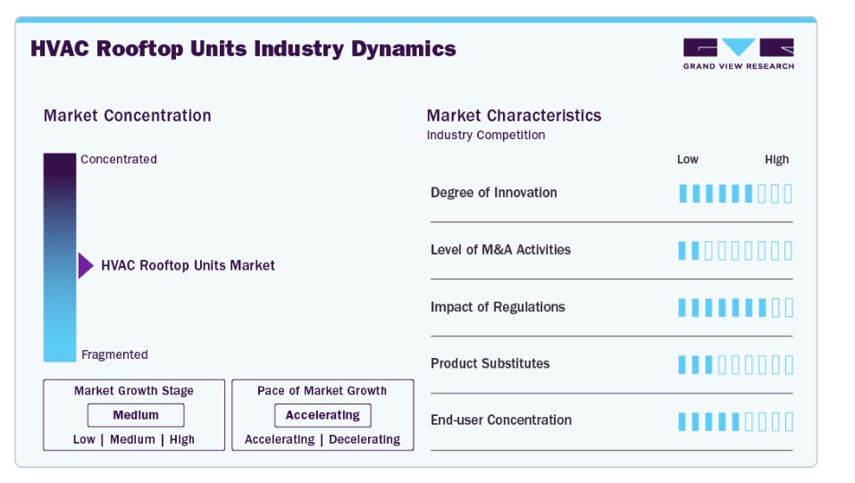 기업과 주택 소유자들이 에너지 비용 절감을 추구함에 따라 첨단 옥상형 장치 도입이 더욱 매력적으로 부상하고 있습니다. 상업 및 산업용 건물에 중앙 집중식 난방, 환기, 공조 기능을 제공하는 옥상형 장치는 공간 절약형 설계와 유지보수의 용이성으로 인해 점점 더 선호되고 있습니다. 또한 저지점온도(GWP) 냉매와 지속 가능한 건축 관행을 장려하는 규제 프레임워크가 시장에 영향을 미치며 차세대 HVAC 시스템 도입을 촉진하고 있습니다.시장 집중도 및 특성HVAC 옥상형 유닛 산업은 에너지 효율성, 자동화, 스마트 연결성 분야의 발전을 중심으로 중간 수준의 혁신을 보이고 있습니다. 주요 제조업체들은 지속가능성 목표와 규제 기준에 부합하기 위해 IoT 기반 모니터링, 적응형 제어, 친환경 냉매 통합에 주력하고 있습니다. 그러나 시장은 성숙하고 표준화가 상당히 진행된 상태이며, 혁신은 주로 점진적인 성능 향상과 시스템 최적화에 집중되어 있어 혁신 속도는 파괴적이라기보다는 균형 잡힌 상태를 유지하고 있습니다.