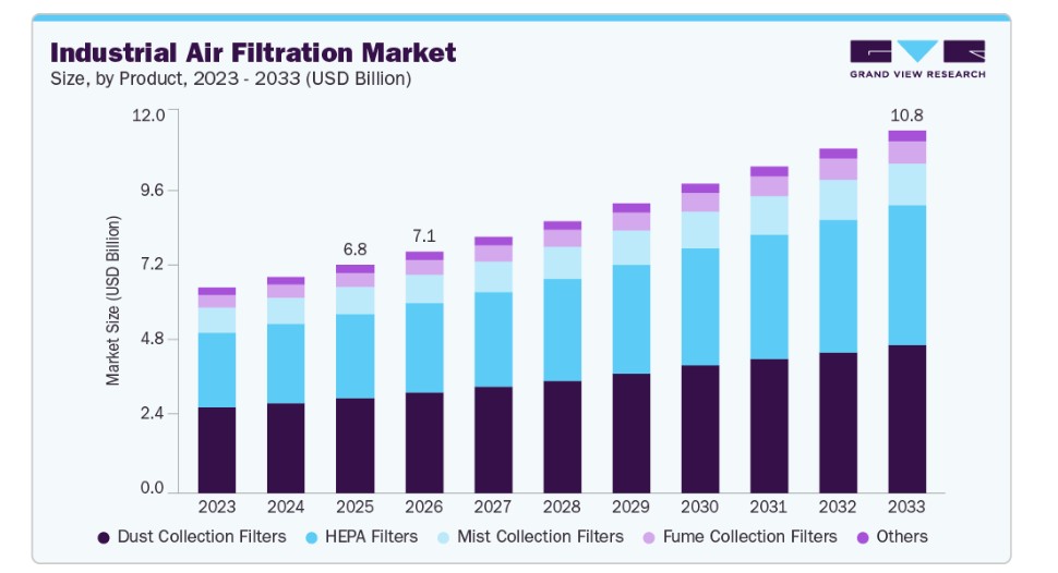 제약 부문은 의약품 생산 증가와 엄격한 클린룸 기준에 힘입어 2025년부터 2033년까지 매출 기준 연평균 성장률(CAGR) 6.7%로 가장 빠르게 성장할 것으로 예상됩니다. 공기 여과는 생산 및 포장 과정에서 공기 중 오염 물질을 제어하는 데 중요한 역할을 했습니다. 규제 당국의 감시가 강화되면서 고효율 여과 시스템의 도입이 가속화되었습니다. 바이오의약품 및 위탁 생산의 성장은 이 부문의 급속한 확장을 뒷받침했습니다.