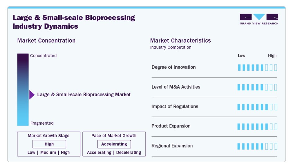 바이오의약품 기업들은 개발 기간을 단축하고 생산 비용을 절감하는 데 도움이 되는 일회용 기술 및 모듈식 바이오 프로세싱 시스템과 같은 유연한 제조 솔루션에 상당한 투자를 하고 있습니다. 바이오의약품에 대한 수요 증가글로벌 바이오 프로세싱 시장을 주도하는 주요 요인 중 하나는 세포 및 유전자 치료, 백신, 재조합 단백질, 단일 클론 항체 등을 포괄하는 바이오의약품의 급속한 성장입니다. 정밀하고 확장 가능한 제조 공정이 필요한 복잡한 치료제 특성상, 대규모 시스템(상업적 생산용)과 소규모 시스템(연구개발 및 임상시험용) 모두에 대한 수요가 증가하고 있습니다. 대규모 바이오프로세싱은 승인된 생물학적 제제의 대량 유통을 위한 일관된 품질과 규정 준수를 보장하는 반면, 소규모 바이오프로세싱은 신속한 시제품 제작과 공정 최적화를 통해 초기 단계 개발을 용이하게 합니다. 만성 질환의 세계적 증가, 고령화 인구, 그리고 맞춤형 의학에 대한 추진은 모두 이러한 생물학적 제제 붐과 밀접한 관련이 있습니다. 암, 자가면역 질환, 파킨슨병 및 알츠하이머병과 같은 신경계 질환과 같은 상태가 더욱 흔해짐에 따라 첨단 치료법이 점점 더 필요해지고 있습니다. CDMO, 바이오테크 스타트업, 제약사들은 모든 규모에서 바이오제조 역량을 확장하고 있습니다. 브랜드 생물학적 제제의 특허 만료로 촉진된 바이오시밀러 사용 증가로 인해 미생물 기반 시스템 및 일회용 솔루션과 같은 효과적이고 경제적인 생물공정 기술에 대한 수요가 더욱 증가하고 있습니다. 보고서 범위 및 제공 내용바이오기술 연구 투자 증가바이오기술 연구 투자 증가 역시 시장을 크게 견인하고 있습니다. 정부와 민간 부문은 학술 기관, 연구 기관, 산업계 간의 협력을 촉진하며 바이오기술 혁신에 상당한 자금을 투입하고 있습니다. 예를 들어 영국 바이오산업협회(BIA)에 따르면, 영국 바이오기술 보조금 지원은 2025/2026년에 증가할 것으로 예상됩니다. 바이오테크 및 의료 분야는 연구개발(R&D)과 장비 자본 투자에 대한 자금을 지원받았습니다. 혁신 자금 지원은 5배 증가했으며, 특히 의료 분야와 같이 디지털화를 진행 중인 자금 지원이 부족한 지역 및 분야에 집중되었습니다. 일회용 시스템, 연속 공정, 모듈식 제조와 같은 첨단 바이오 공정 기술의 개발 및 상용화는 증가된 자금 지원으로 가속화되고 있습니다. 또한, 기존에 지원이 부족했던 지역에 새로운 연구 시설과 파일럿 규모 단위를 구축할 수 있게 되어, 신생 기업과 기존 바이오제약 기업 모두 신약 치료법의 효율적인 확장에 도움을 주고 있습니다. 전반적으로 이러한 투자는 생산 유연성을 개선하고, 규제 대비 태세를 강화하며, 급변하는 바이오테크 환경에서 글로벌 경쟁력을 높입니다. 시장 집중도 및 특성대규모 및 소규모 바이오프로세싱 산업의 높은 혁신성은 시장 성장을 주도하는 핵심 동력입니다. 자동화 생물반응기 시스템, 실시간 분석, 공정 집약화, AI 기반 공정 최적화 등의 지속적인 발전은 생물학적 제제의 개발 및 제조 방식을 변화시키고 있습니다. 연속 바이오프로세싱, 일회용 기술, 모듈식 시설과 같은 혁신은 더 빠르고 유연하며 비용 효율적인 생산을 가능하게 합니다. 예를 들어, 2025년 4월 써모피셔사이언티픽은 가속기 플랫폼과 고수율 CHO K-1 세포주를 포함한 향상된 통합 플랫폼 솔루션을 공개하여 신약 임상시험(IND) 신청 기간을 13개월에서 9개월로 단축했습니다. 이러한 솔루션은 최대 8g/L의 단백질 발현과 안정적인 생산을 제공하여 유전자에서 환자까지 생물학적 제제 개발을 간소화합니다. 이러한 혁신은 개발 기간 단축, 확장성 향상, 제품 일관성 제고를 가져오며, 이는 단일클론 항체 및 세포·유전자 치료제와 같은 복잡한 치료제에 특히 중요합니다. 바이오프로세싱 및 바이오의약품 산업에서 증가하는 인수합병(M&A) 건수는 업계 역학에 큰 영향을 미칩니다. 대형 제약 및 바이오테크 기업들은 기술 포트폴리오 강화, 생산 능력 확장, 첨단 바이오프로세싱 플랫폼 확보를 위해 혁신적인 중소기업을 적극적으로 인수하고 있습니다. 예를 들어, 2024년 10월 스위스 기업 론자(Lonza)는 12억 달러에 캘리포니아 바카빌 소재 제넨테크(Genentech)의 대규모 바이오제조 시설 인수를 완료하며 글로벌 포유류 생산 네트워크를 확장했습니다. 이러한 전략적 통합은 제품 개발 파이프라인을 가속화하고 시장 출시 시간을 단축하며 통합된 종단간 바이오제조 솔루션을 촉진하여 글로벌 바이오프로세싱 시장의 전반적인 성장과 성숙에 기여하고 있습니다. 규제 프레임워크는 품질, 안전성 및 규정 준수에 대한 엄격한 요구사항을 설정함으로써 바이오프로세싱 산업을 강력하게 형성합니다. 미국 FDA 및 EMA와 같은 기관의 지침은 바이오프로세싱 시스템이 높은 GMP, 검증 및 데이터 무결성 기준을 충족하도록 보장합니다. 이러한 규정은 소규모 기업에게는 어려울 수 있지만, 궁극적으로 첨단 규정 준수 기술과 더 큰 공정 표준화에 대한 수요를 촉진합니다. 기업들이 생물학적 제제 제조의 진화하는 수요를 충족시키기 위해 지속적으로 첨단 기계, 소모