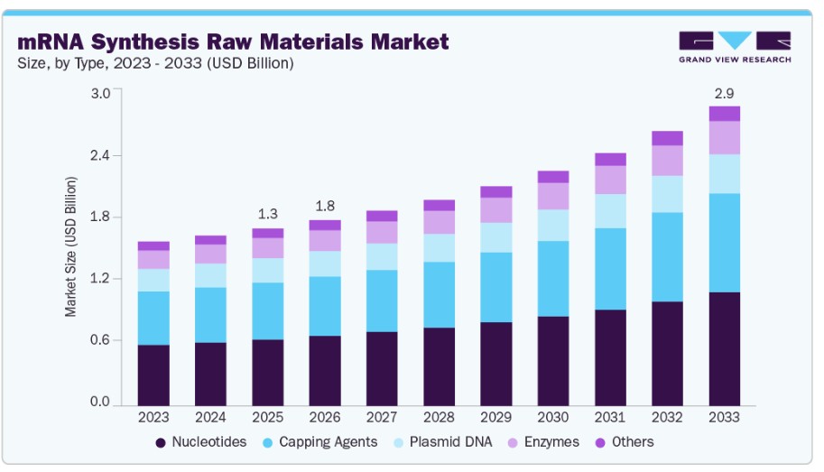 안정성, 번역 효율성 및 면역 내성을 개선하는 의사 우리딘(pseudo uridine) 및 5-메틸시티딘(5-methylcytidine)과 같은 화학적으로 변형된 뉴클레오티드와 같은 특수 원료에 대한 수요는 mRNA 합성 기술의 발전에 의해 주도되고 있습니다. 예를 들어, 2025년 3월 텔리시스 바이오(Telesis Bio)는 신속한 DNA 및 mRNA 합성을 위한 자사의 깁슨 SOLA 기술 개발을 위해 최대 2,100만 달러를 조달하여 현장에서 고품질 핵산 생산을 가능하게 했습니다. 효소 합성 및 체외 전사 프로토콜의 발전으로 인해 더 높은 수율과 순도를 달성하기 위해 고성능 효소 및 시약도 더욱 필요해지고 있습니다.