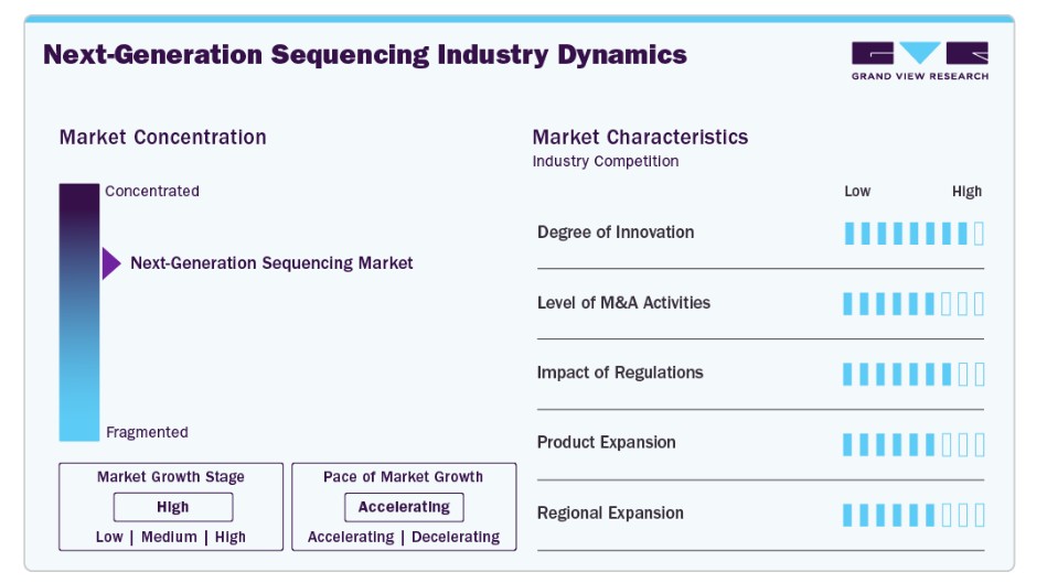 임상 진단 분야의 확대 적용차세대 시퀀싱 산업의 성장은 주로 임상 진단 분야에서의 NGS 적용 확대에 기인하며, 이는 시장을 주도하는 주요 요인입니다. 이 기술은 정확하고 신속하며 포괄적인 유전체 정보를 제공함으로써 의사가 질병을 진단하고 추적하는 방식을 변화시킵니다. 특히 비침습적 산전 검사(NIPT)에서의 활용이 가장 두드러지며, 태아에 해를 끼치지 않고 염색체 결함을 조기에 정확하게 식별할 수 있게 합니다. 또한 NGS는 희귀 질환 진단, 보인자 선별 검사, 종양학 검사 등 유전자 변이 검출이 표적 치료 및 질병 관리 적용에 핵심적인 분야에서 널리 활용됩니다. 차세대 염기서열 분석(NGS)은 감염병 진단 분야에 혁신을 가져와, 비교할 수 없는 속도와 정확도로 감염을 신속하게 탐지하고 추적할 수 있게 합니다. 세계 최초의 실용성은 코로나19 팬데믹 기간에 입증되었으며, 현재도 변이 및 위협 추적에 활용되고 있습니다. NGS 기반 임상 검사에 대한 규제 승인의 변화와 임상 지침에서의 느리지만 꾸준한 채택은 이러한 검사의 수용성을 크게 높였습니다. 기술 발전기술 발전은 차세대 염기서열 분석 산업 성장을 주도하는 주요 요인입니다. 기술은 크게 발전하여 오늘날 전장유전체, 전장엑솜 및 표적 시퀀싱이 가장 진보적이면서도 동시에 가장 비용 효율적인 유전자 분석 방법이 되었습니다. 이는 유전체학 분야를 더 많은 실험실과 임상 환경에 개방하여 유전 질환, 암, 심지어 바이러스 연구를 위한 상당량의 고품질 데이터를 신속하고 효율적으로 생성할 수 있게 했습니다. 휴대용 자동화 고처리량 시퀀싱 시스템의 발명으로 NGS는 선택받는 기술이 되었습니다. AI 기반 생물정보학, 클라우드 기반 분석, 벤치탑 및 나노포어 기반 플랫폼은 모두 테스트, 데이터 해석, 유연성의 분산화에 기여했습니다. 또한 이러한 혁신은 연구 및 임상 환경에서 NGS 활용을 증가시켰을 뿐만 아니라 맞춤형 의학, 역학, 신약 개발의 성장을 지원했습니다. 보고서 범위 및 제공 항목시장 집중도 및 특성차세대 시퀀싱 산업은 단일 세포 및 장독자 시퀀싱, AI 기반 데이터 분석을 포함한 시퀀싱 기술의 지속적인 발전으로 높은 수준의 혁신을 누리고 있습니다. 예를 들어, 2025년 2월 로슈는 미국에서 SBX 시퀀싱 기술을 출시하며 Xpandomer 화학을 도입해 임상 및 연구용 유전체 응용 분야의 신호 선명도, 정확도 및 확장성을 향상시켰습니다. 이러한 혁신은 정확성, 속도, 임상적 유용성을 높이는 동시에 비용을 절감하여 광범위한 연구, 진단 및 맞춤형 의학의 채택을 촉진합니다. 차세대 시퀀싱 산업은 인수합병(M&A)이 눈에 띄게 증가하면서 시장 성장과 통합이라는 이중 효과를 경험하고 있습니다. 업계 주요 기업들은 기술 역량뿐만 아니라 제품 범위와 다양한 분야로의 접근성을 확대하기 위해 소규모의 창의적인 기업들을 인수하고 있습니다. 예를 들어, 2025년 6월 일루미나(Illumina)는 프로테오믹스 및 다중 오믹스 역량 강화를 목표로 스탠다드 바이오툴스(Standard BioTools)로부터 소마로직(SomaLogic)을 최대 4억 2,500만 달러에 인수하기로 합의했습니다. 이 같은 추세는 기업들이 유전체학 및 맞춤형 의학 분야의 신흥 기회를 활용하려는 노력과 함께 지속될 것으로 예상됩니다. 유전체학 및 맞춤형 의학 분야에서. 차세대 시퀀싱 산업은 시퀀싱 기술의 안전성과 품질을 보장하는 규제 프레임워크에 크게 의존합니다. FDA와 유럽 규제 기관들은 점차 더 많은 기업들을 승인해 왔으며, 이는 임상 적용에 큰 도움이 되었습니다. 동시에 명확한 기준은 환자와 제공자 간의 신뢰를 심어주고 있습니다. 데이터 프라이버시와 유전 정보에 대한 새로운 규제는 엄격하지만, 적극적으로 혁신을 주도하고 차세대 시퀀싱 산업을 발전시키며 NGS의 수용성을 높이고 있습니다. 제품 확장은 차세대 시퀀싱 산업의 주요 동력으로, 기업들은 다양한 연구 및 임상 수요를 충족시키기 위해 새로운 시퀀싱 플랫폼, 시약, 생물정보학 도구를 도입하고 있습니다. 휴대용 시퀀서, 개선된 라이브러리 준비 키트, 고급 데이터 분석 소프트웨어와 같은 혁신은 효율성을 높이고 응용 분야를 확대합니다. 제품 포트폴리오 확장은 기업이 학계, 제약, 의료 등 다양한 최종 사용자에게 서비스를 제공할 수 있게 하여 시장 성장과 채택을 가속화합니다. 차세대 시퀀싱 산업은 주로 지역적 확장에 의해 주도되며, 이는 기업들이 아시아 태평양, 라틴 아메리카, 중동과 같은 신흥 지역에서의 입지를 강화하는 핵심 요소입니다. 의료 인프라 개선, 정부의 지원 정책, 맞춤형 의학에 대한 인식 제고가 수요를 촉진하는 한편, 현지 파트너십 및 유통망 확대로 접근성이 향상되고 있습니다. 제품 인사이트소모품 부문은 2025년 시장 매출에서 가장 큰 비중을 차지했으며, 2026년부터 2033년까지 가장 빠른 연평균 복합 성장률(CAGR)을 보일 것으로 예상됩니다. 이 부문의 높은 점유율과 기하급수적인 성장률은 주로 NGS의 상업적 및 연구 응용 분야에서 소모품의 반복적 사용과 높은 수요에 기인합니다. 이러한 소모품에는 시료 준비 키트와 표적 농축 키트가 포함됩니다. 대부분의 제약사와 