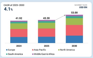 안료 분산 시장은 2025년 433억 달러에서 2030년 530억 달러 규모로 성장할 것으로 전망되며, 2025년부터 2030년까지 연평균 복합 성장률(CAGR) 4.1%를 기록할 것으로 예상됩니다. 안료 분산 시장은 페인트 및 코팅, 자동차, 포장, 플라스틱, 섬유 등 주요 최종 사용 산업의 수요 증가에 힘입어 견조한 성장세를 보이고 있습니다.