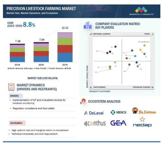 정밀 축산 시장은 연구 기간 동안 연평균 복합 성장률(CAGR) 8.8%를 기록하며 2030년까지 121억 2천만 달러 규모에 도달할 것으로 전망됩니다.