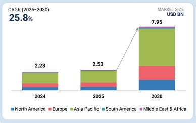글로벌 스마트 항만 시장은 2025년부터 2030년까지 연평균 복합 성장률(CAGR) 25.8%로 성장하여 2025년 25억 3천만 달러에 달하고 2030년까지 79억 5천만 달러로 증가할 것으로 예상됩니다. 이러한 성장은 효율적이고 안전하며 환경 친화적인 항만 운영에 대한 수요 증가에 의해 주도됩니다. 스마트 항만 활용은 실시간 관리, 효율적인 화물 처리, 단축된 회전 시간, 운영 비용 절감을 가능하게 하여 현대 해상 무역에 필수적입니다. 전통적 항만은 AI, IoT, 블록체인, 디지털 트윈 시스템 등의 기술 점진적 도입을 통해 지능형 생태계로 진화하며 다양한 개입을 허용합니다. 또한, 특히 신흥 경제국에서 항만 시설 현대화 및 개발을 위한 정부 정책으로 수요가 크게 증가하고 있습니다. 탄소 배출 감축과 글로벌 지속가능성 기준 준수를 위한 노력 또한 항만에서의 스마트 에너지 및 자동화 솔루션 도입을 촉진하고 있습니다. 디지털 기술 비용이 지속적으로 하락하고 통합이 용이해짐에 따라 스마트 항만은 글로벌 공급망 효율성에 더욱 접근 가능하고 핵심적인 역할을 수행하게 될 것입니다.