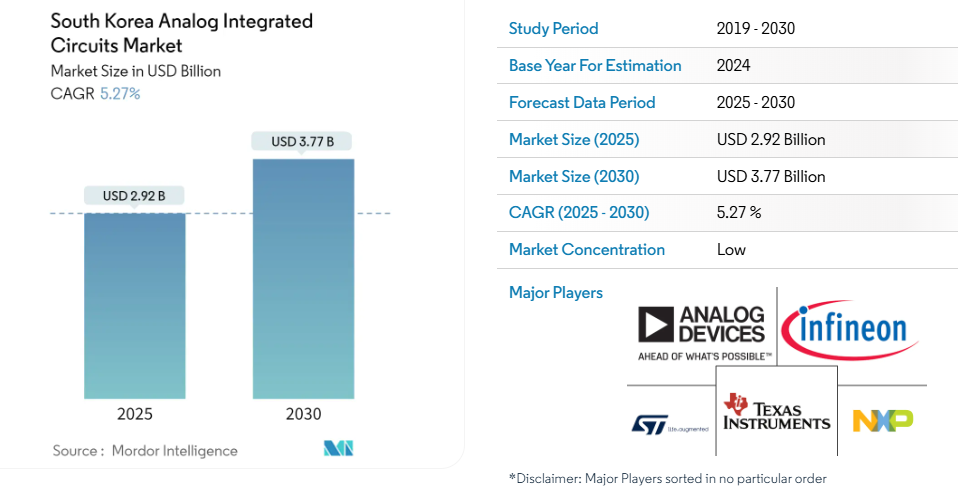 한국의 아날로그 집적회로 (IC) 시장 : 시장규모, 점유율, 성장동향, 전망 (2025-2030)