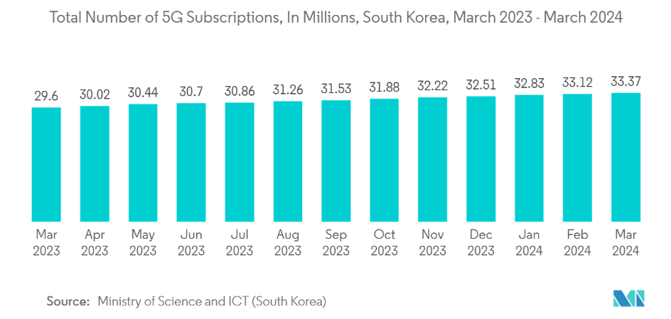 • 한국의 강력한 5G 생태계는 연구 대상 시장의 성장을 크게 견인할 것으로 보입니다. 예를 들어, 과학기술정보통신부(한국)에 따르면 2023년 3월 현재 한국의 5G 가입자 수는 약 2,960만 명으로 2022년 3월의 2,291만 명에 비해 크게 증가했습니다. 2024년 3월 현재 한국의 5G 가입자 수는 약 3,340만 명입니다.