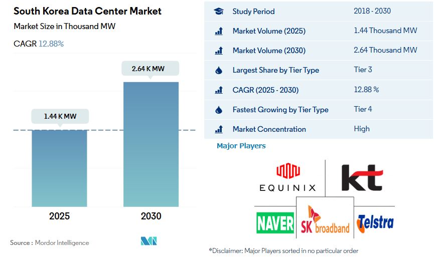 Equinix Inc., KT Corporation, Naver, SK Broadband, Telstra Corporation Limited는 한국 데이터 센터 시장에서 주요 기업입니다.