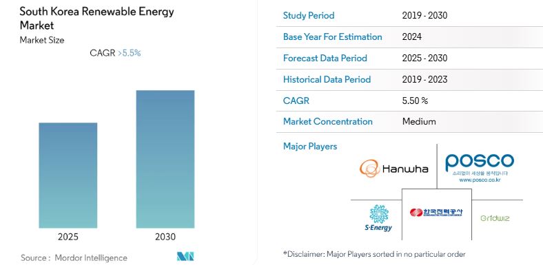 한국 재생에너지 산업 개요한국의 재생에너지 시장은 부분적으로 분열되어 있습니다. 주요 업체들(순서대로 나열되지 않음)로는 한화, 그리드위즈, 한국전력공사, 포스코에너지, 에스에너지 등이 있습니다. 한국 재생 에너지 시장 뉴스