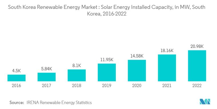 중기적으로, 화석 연료 수입 의존도 감소, 환경에 대한 인식 제고, 그리고 파리 기후 협정에 따른 정부의 추진과 같은 요인들이 예측 기간 동안 한국 재생 에너지 시장의 수요를 증가시킬 것으로 예상됩니다.