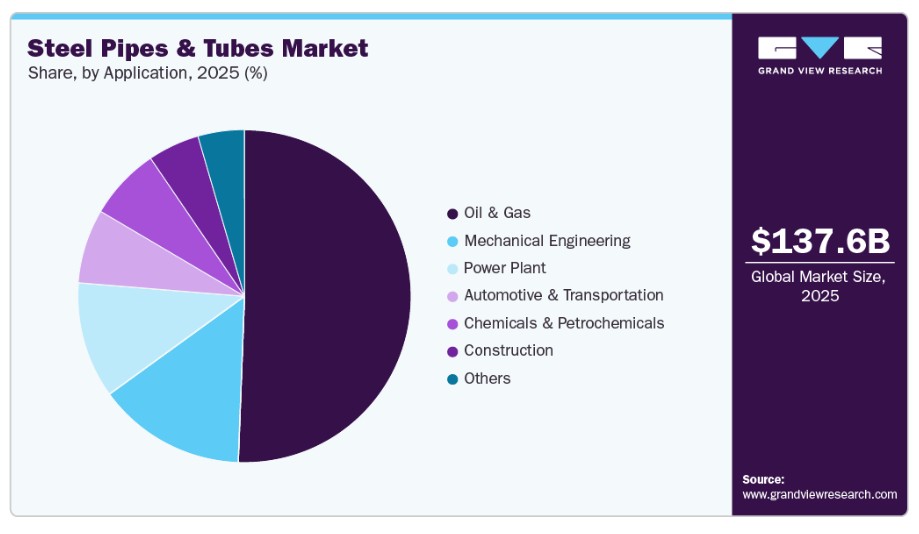 2025년 석유 및 가스 부문은 매출 점유율 50.0% 이상을 차지했습니다. 원유, 천연가스 및 LNG 수송을 위한 파이프라인 인프라 확장은 강관 및 튜브의 석유·가스 응용 분야를 이끄는 주요 성장 동력입니다. 신규 유전의 생산량 증가와 원격 매장지를 수요 중심지에 연결해야 할 필요성으로 인해 장거리 수송망에 대한 투자가 가속화되고 있습니다. 예를 들어, 2025년 12월 인도는 국내 생산 증대와 에너지 수입 의존도 감소를 위해 제10차 개방 면적 라이선싱 정책(OALP-X), 제4차 발견 소규모 유전(DSF-IV), 특별 석탄층 메탄(CBM) 라운드 등 여러 입찰 라운드를 통해 50개의 새로운 석유 및 가스 탐사 구역을 공개했습니다. 이러한 프로젝트들은 고압 및 다양한 기후 조건에서 작동할 수 있는 고강도 탄소강 파이프에 크게 의존하고 있어, 전 지역적으로 지속적인 수요를 이끌고 있다.