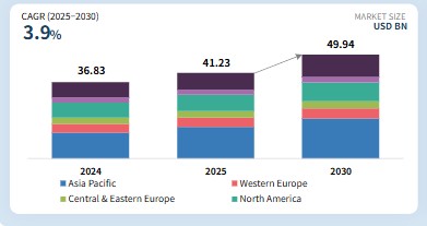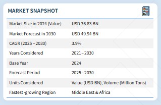 전 세계 황산 시장은 2025년 412억 3천만 달러에서 2030년까지 499억 4천만 달러로 성장할 것으로 예상되며, 예측 기간 동안 연평균 성장률(CAGR)은 3.9%를 기록할 전망이다. 황산은 다용도성과 강한 산성 특성으로 인해 다양한 산업 분야에서 사용되는 산업용 화학물질입니다. 주로 황철광, 원소 황, 비금속 제련소 등의 원료로부터 생산됩니다. 원소 황은 다른 원료보다 입수하기 쉬워 황산 생산에 가장 흔히 사용되는 원료입니다. 이 산은 농축 황산, 배터리 산, 챔버 산 등 다양한 형태로 생산되며, 최종 사용 목적에 따라 접촉 공정과 이중 접촉 이중 흡수(DCDA) 공정이라는 두 가지 주요 방법으로 처리됩니다. 시장 관점에서 황산은 일반적으로 비료, 금속 가공, 화학 제조, 석유 정제, 펄프 및 제지, 섬유, 자동차 및 기타 산업에서의 응용 분야에 따라 분류될 수 있습니다. 시장 성장은 또한 농업 생산성 향상, 도시화로 인한 인프라 확장, 정제 금속 및 화학 제품에 대한 수요 증가로 인해 촉진되고 있으며, 이들 모두 생산 과정에서 황산에 크게 의존하고 있습니다.
