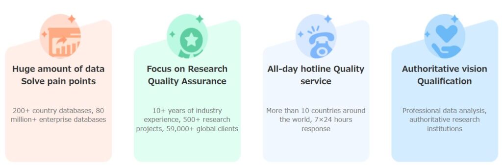 고객의 실제 비즈니스 요구에 따라 고객에게 맞춤형 서비스를 제공하고 빠르고 최적화된 고품질의 서비스 경험을 제공합니다. 북미, 유럽 및 아시아 태평양 지역의 시장 조사 및 설문조사를 전문으로 합니다.